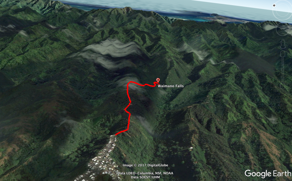 Waimano Falls is located in Central Oahu, near Pearl City. The trailhead starts at the end of Komo Mai Drive.